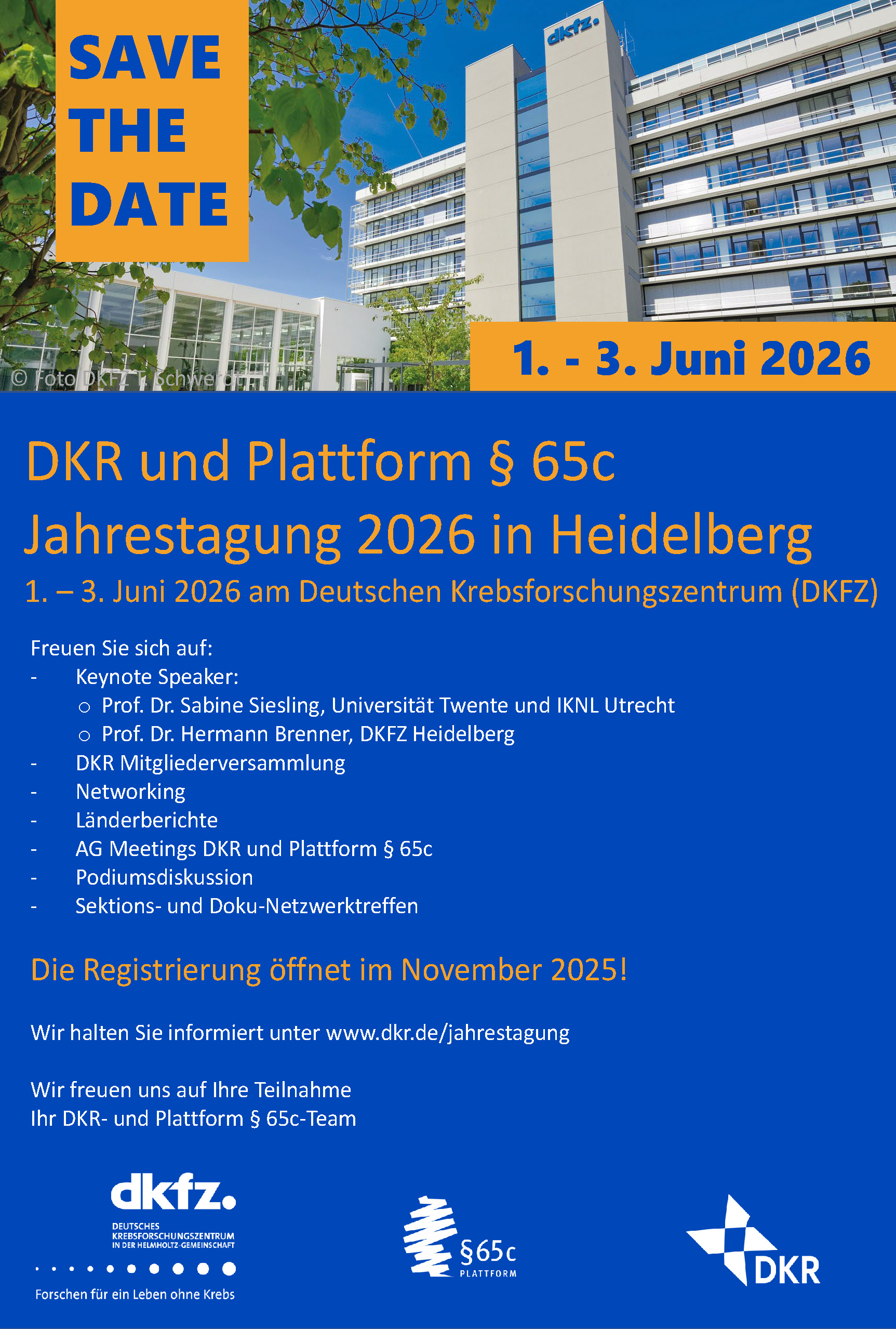 Die DKR e.V. Jahrestagung mit Plattform § 65c 2026 findet vom 1. bis zum 3. Juni in Heidelberg im Kommunikationszentrum des Deutschen Krebsforschungszentrums - DKFZ statt.