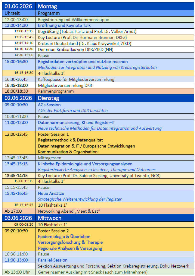 Diese erste Jahrestagung ist eine besondere Gelegenheit, Impulse zu setzen, gemeinsame Visionen zu entwickeln und den Austausch innerhalb der Krebsregistrierung zu stärken. Wir freuen uns auf drei inspirierende Tage, lebendige Diskussionen und Ihr aktives Mitwirken.