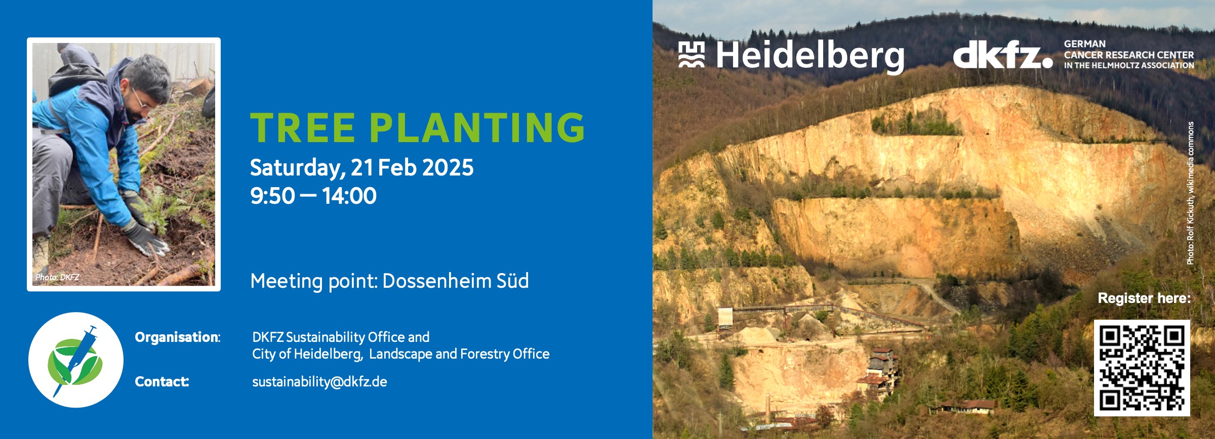 Where: We'll meet at 10:00 AM at the Dossenheim Süd S-Bahn station and hike for about 30 minutes along the impressive quarry. At the Drei Eichen parking lot, we'll join the Heidelberg Forestry Office. From there, we'll walk together for another 20 minutes to the planting site, where we'll get to work and plant new trees. For those arriving by car, the meeting point is the Drei Eichen parking lot at 10:30 AM. To help us coordinate travel, we ask the following: