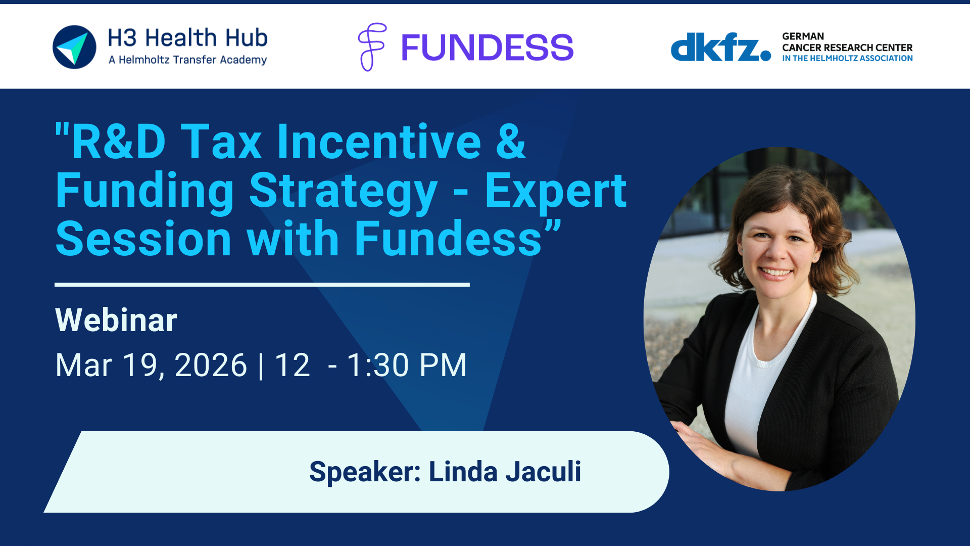 Securing the right mix of funding sources is essential for advancing cutting-edge research and innovation. In this webinar, the German Cancer Research Center (DKFZ) and the H3 Health Hub welcome Linda Jaculi from Fundess GmbH as a guest expert to provide practical insights into the R&D Tax Incentive (Forschungszulage) and effective funding strategies for research institutions, start-ups, and technology-driven companies.